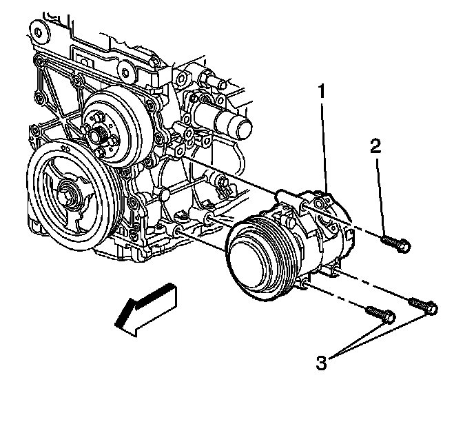 9. Remove the A/C compressor mounting bolts (2, 3) ONLY.