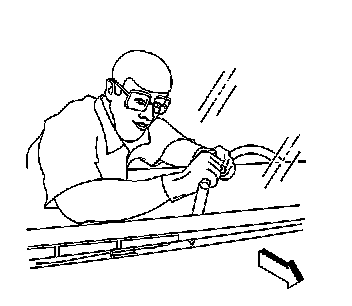 9. Remove the bottom of the window from the urethane adhesive using a long utility knife or similar tool. Keep the cutting edge of the utility knife against the glass.