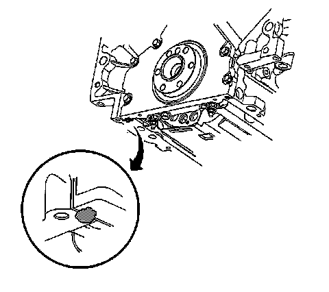 1. Apply a 5 mm (0.20 in) bead of sealant 20 mm (0.80 in) long to the oil pan to engine block junction. Refer to Sealers, Adhesives, and Lubricants (Sealers, Adhesives, and Lubricants) for the correct part number.