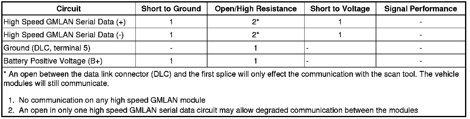 * This test is used for a total high speed GMLAN communication failure. If only one module is not communicating and sets no DTC, ensure that the vehicle is equipped with the module, then use DTC U0100-U0299 for diagnostics.