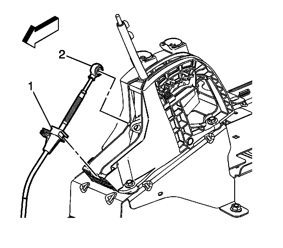 5. Install the range selector cable end (2) to the transmission shift control lever ball stud.