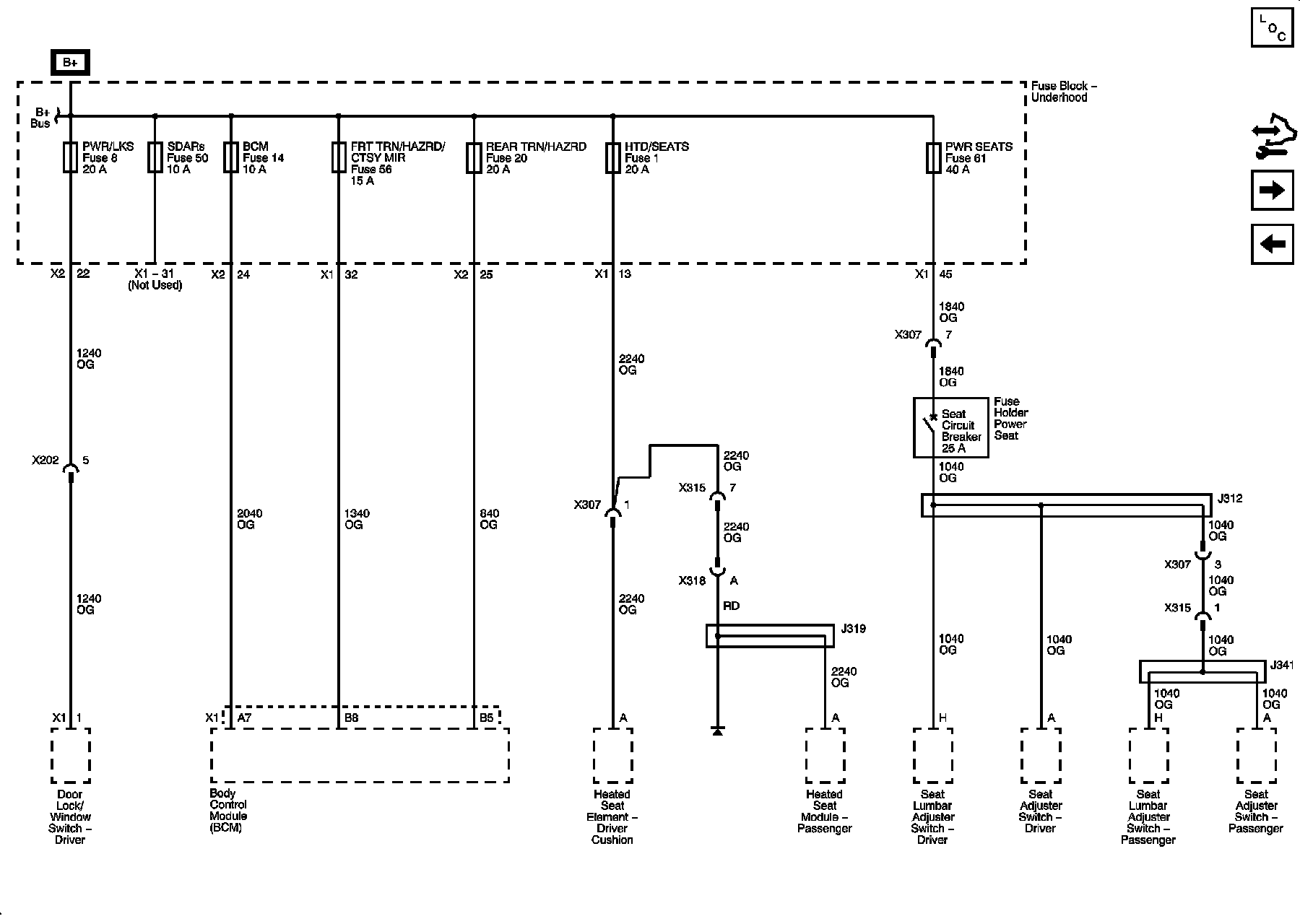 BCM, FRT TRN/HAZRD/CTSY MIR, HTD/SEATS, PWR/LKS, PWR SEATS, REAR TRN/HAZRD, and SDARs Fuses
