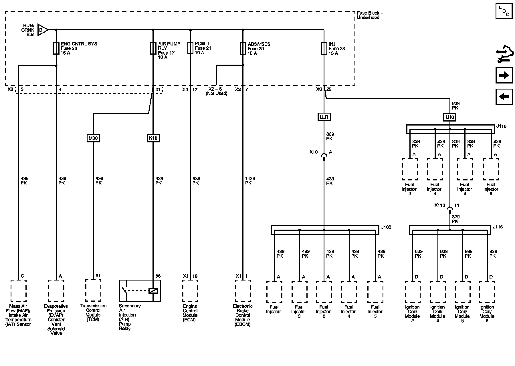 RUN/CRNK Relay Bus - 3 of 3, AIR PUMP RLY, ENG CNTRL SYS, INJ, and PCM-I Fuses