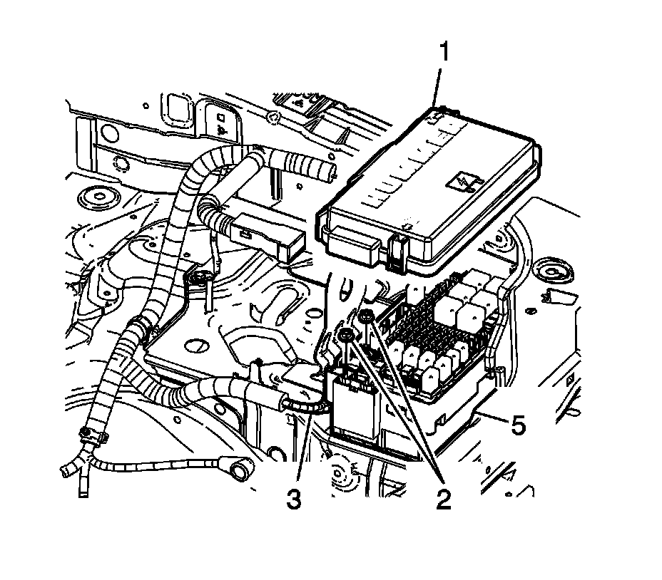 6. Install the underhood electrical center cover (1) to the electrical center base (5).