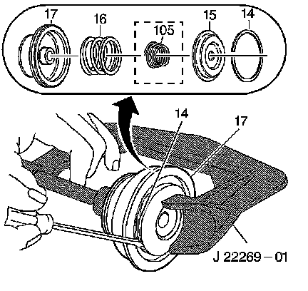 3. Install the servo cushion outer spring (16), the servo cushion inner spring (105) (model dependent) and the cushion spring retainer (15) in the 2nd apply piston (17).