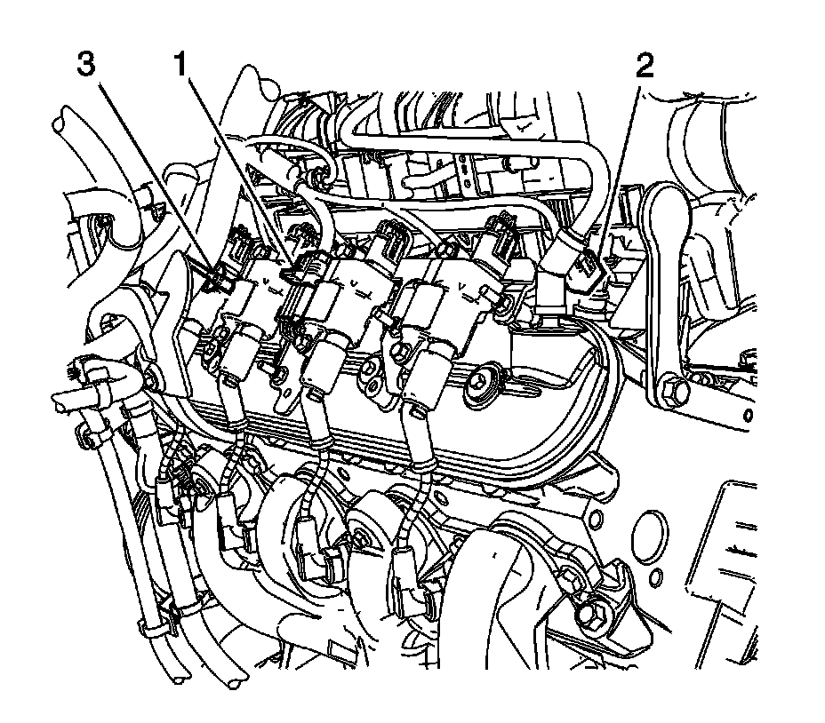 12. Remove the engine harness clip (3) from the ignition coil bracket stud.