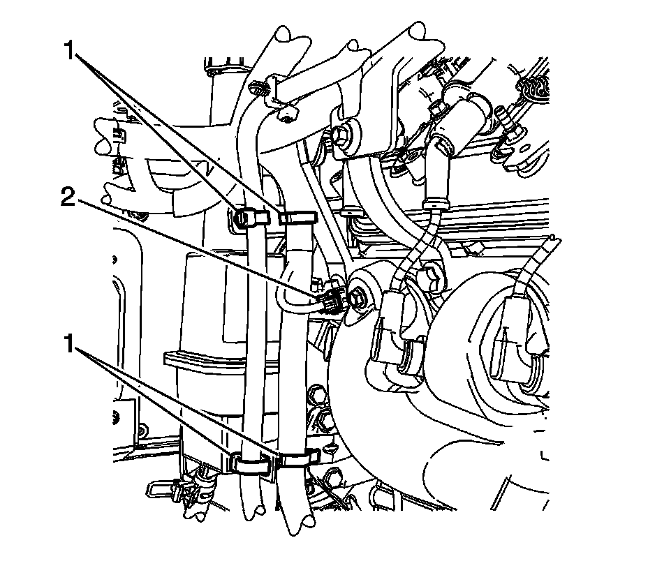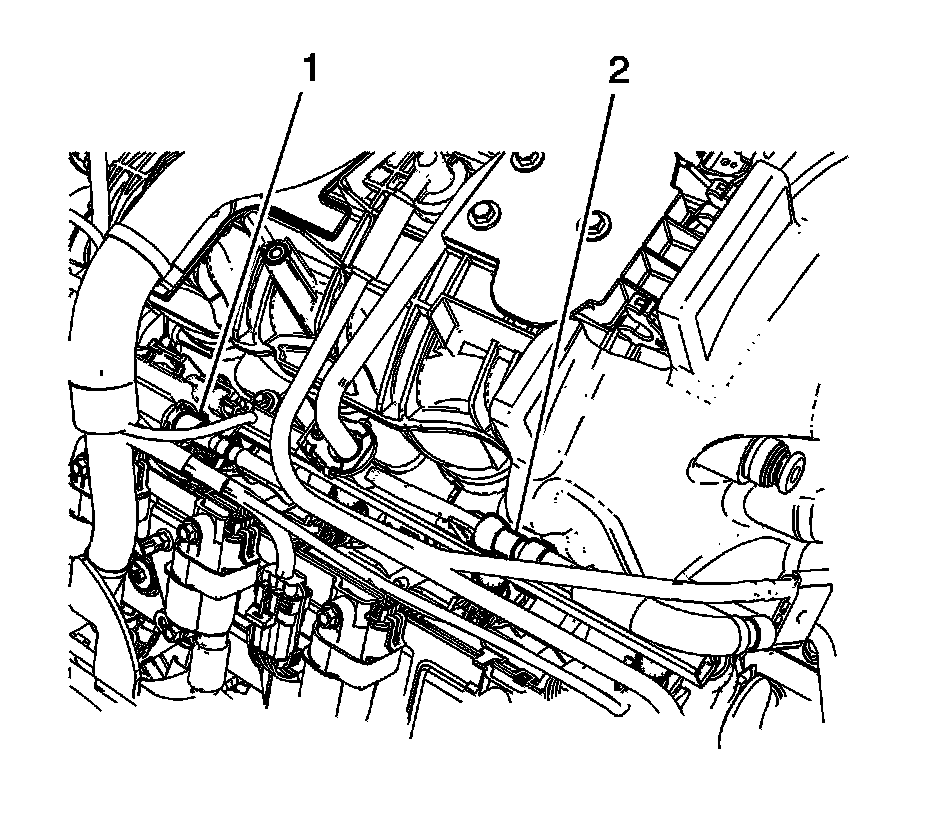 22. Disconnect the fuel feed line quick connect fitting (2) from the fuel rail. Refer to Metal Collar Quick Connect Fitting Service (Metal Collar Quick Connect Fitting Service) .