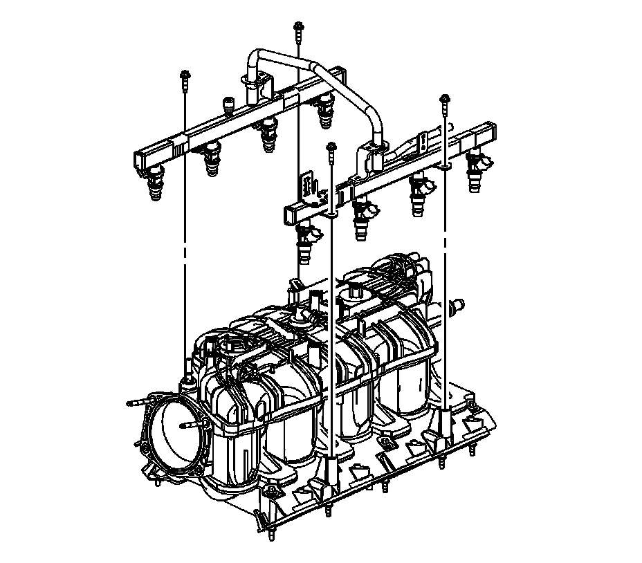Important: Lift evenly on both sides of the fuel rail until all injectors are removed from their bores.