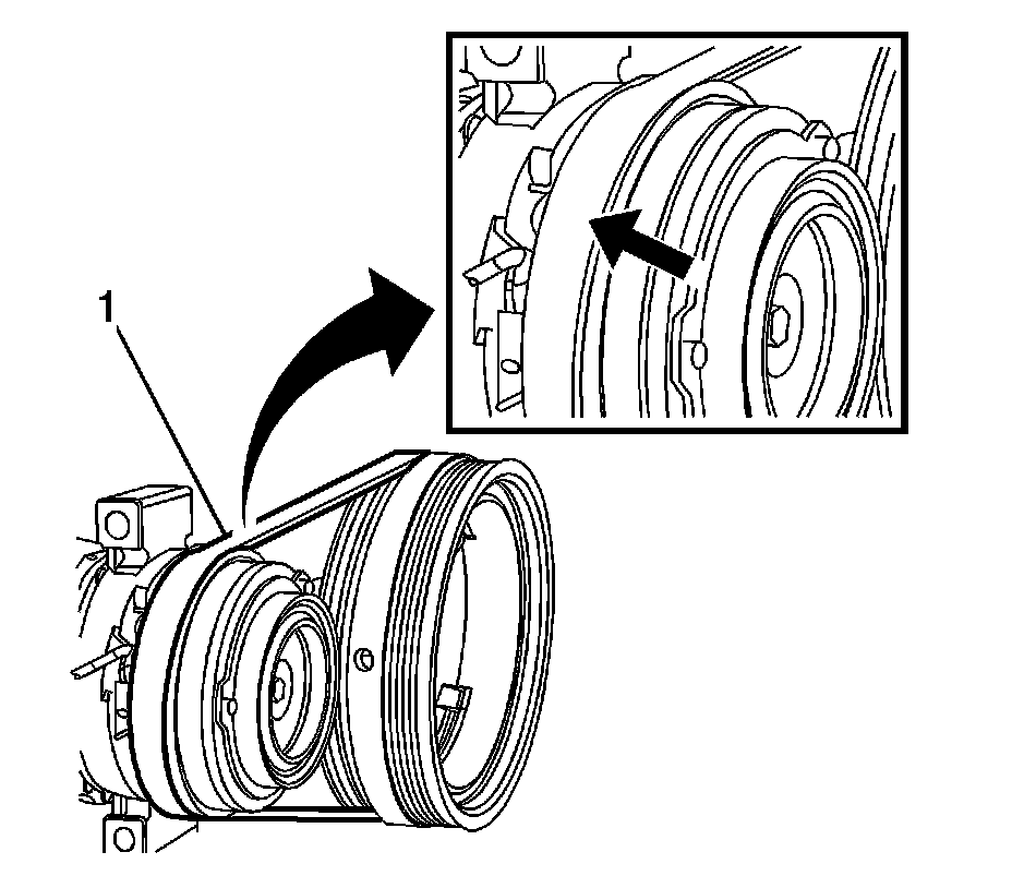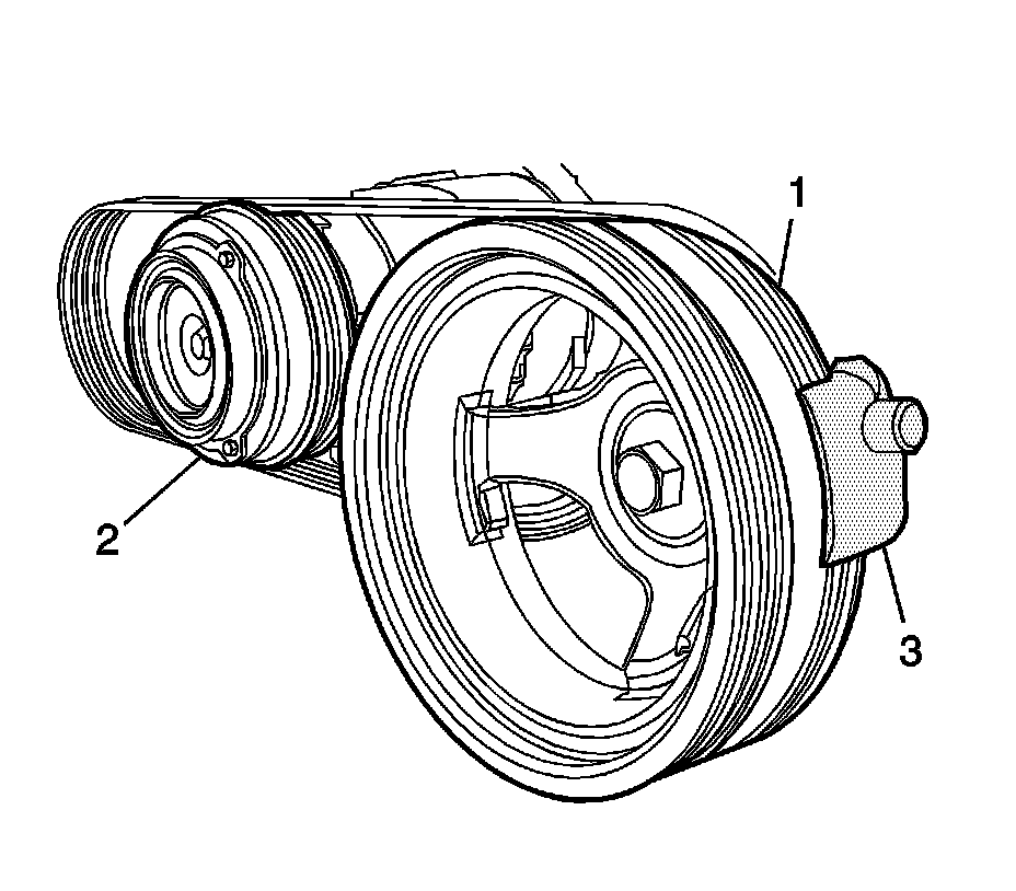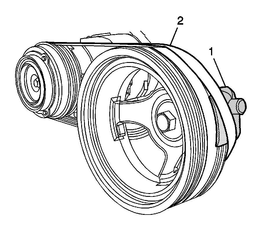 1. Position the belt behind the rear face of the balancer (1) and off of the A/C pulley (2).