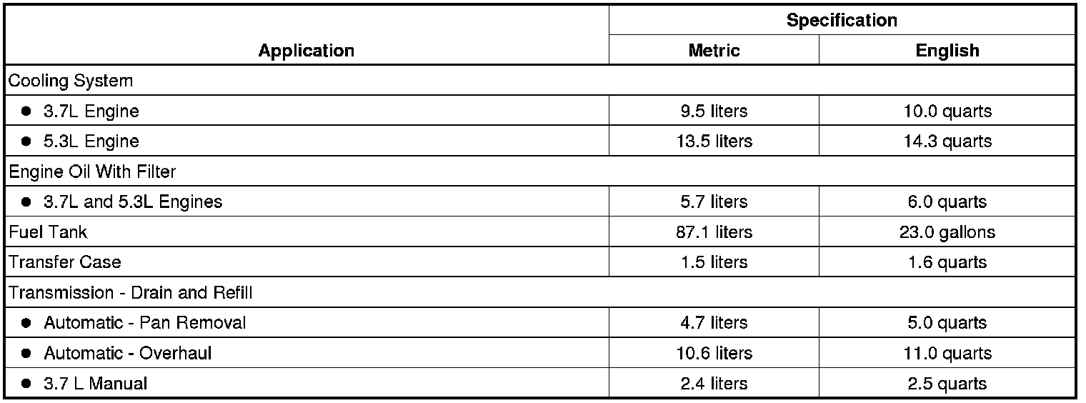 The following approximate capacities are given in English and metric conversions. See Fluid and Lubricant Recommendations ([1][2]Fluid Type Specifications) for more information. All capacities are approximate. When adding, be sure to fill to the approximate level, as recommended in this manual. Recheck fluid level after filling.