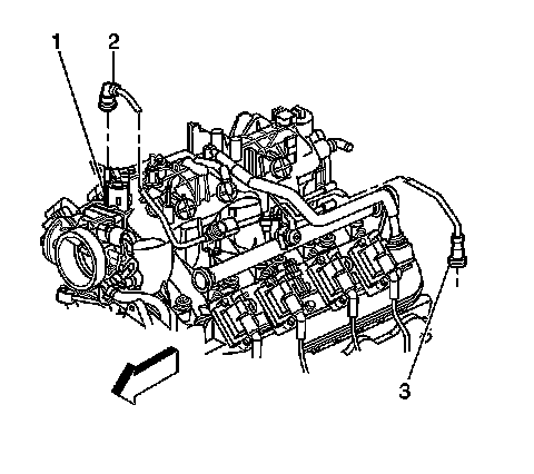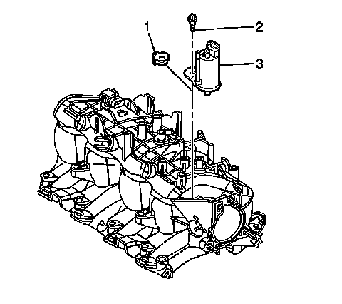 8. Remove the EVAP purge solenoid bolt (2), solenoid (3), and isolator (1) from the intake manifold.