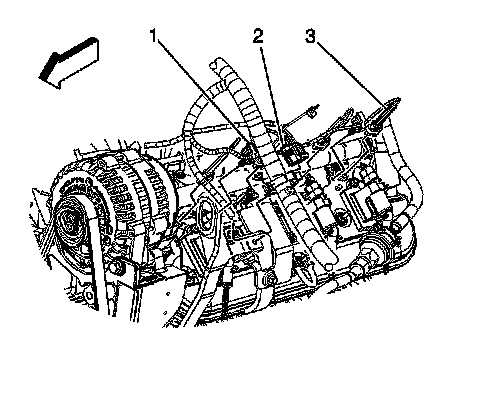 13. Remove the harness bracket nut (2) in order to remove the engine harness from the intake manifold.