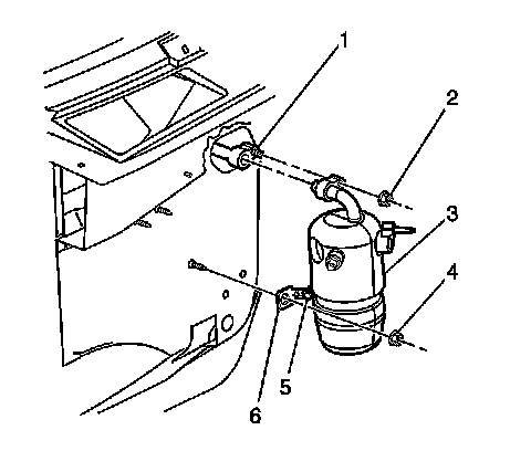9. Remove the retaining bracket (6) from the accumulator (3).