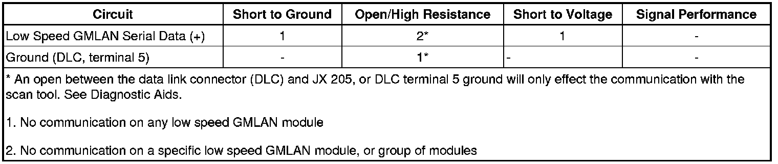 Modules connected to the low speed GMLAN serial data circuit monitor for serial data communications during normal vehicle operation. Operating information and commands are exchanged among the modules when the ignition switch is in any position other than OFF. The low speed GMLAN serial data circuit uses JX 205, JX 207, and, if equipped, JX 206 as common connection points between some modules and the data link connector (DLC).