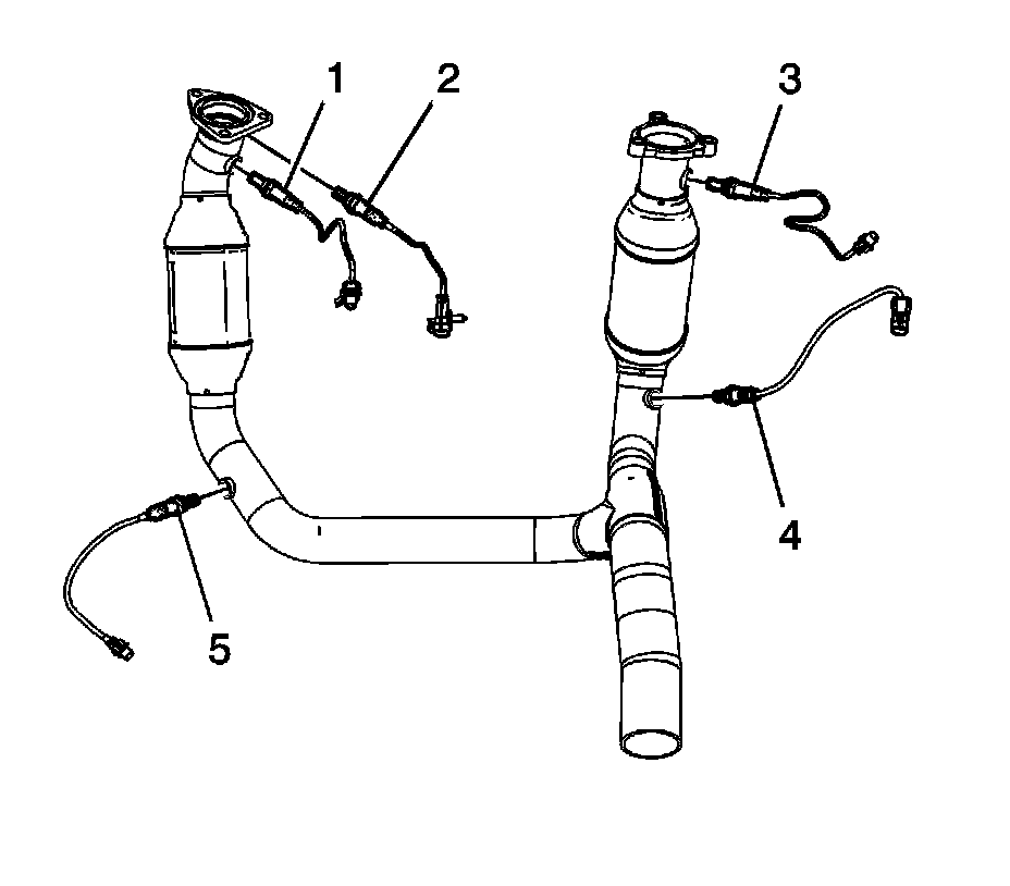 3. If replacing the three way catalytic converter remove the heated oxygen (HO2S) sensors (1 - 5) otherwise disconnect the heated oxygen (HO2S) sensors harness connectors. Refer to Heated Oxygen Sensor Replacement - Bank 1 Sensor 1 (Heated Oxygen Sensor Replacement - Bank 1 Sensor 1) , Heated Oxygen Sensor Replacement - Bank 1 Sensor 2 (Heated Oxygen Sensor Replacement - Bank 1 Sensor 2) , Heated Oxygen Sensor Replacement - Bank 2 Sensor 1 (Heated Oxygen Sensor Replacement - Bank 2 Sensor 1) and Heated Oxygen Sensor Replacement - Bank 2 Sensor 2 (Heated Oxygen Sensor Replacement - Bank 2 Sensor 2).
