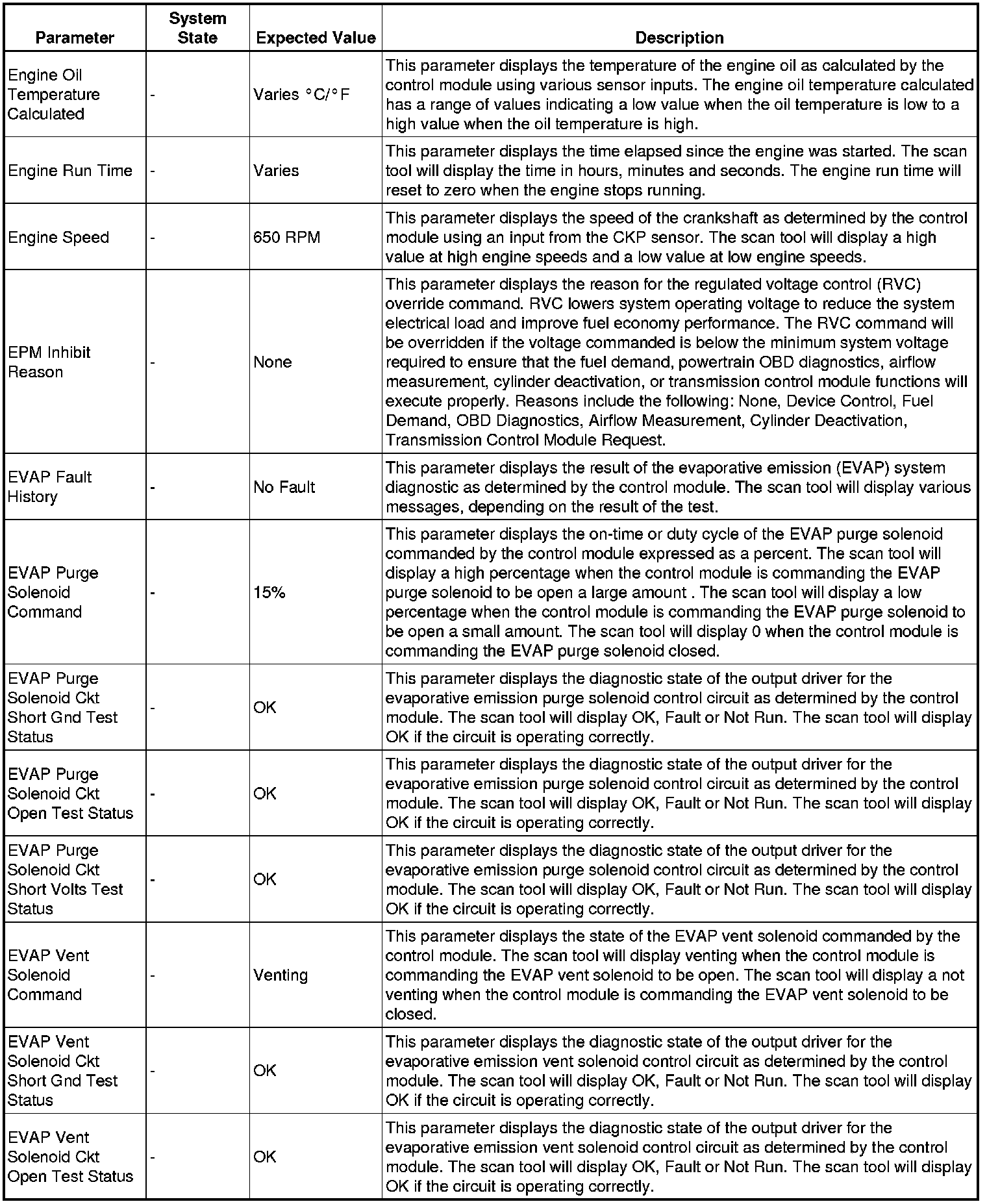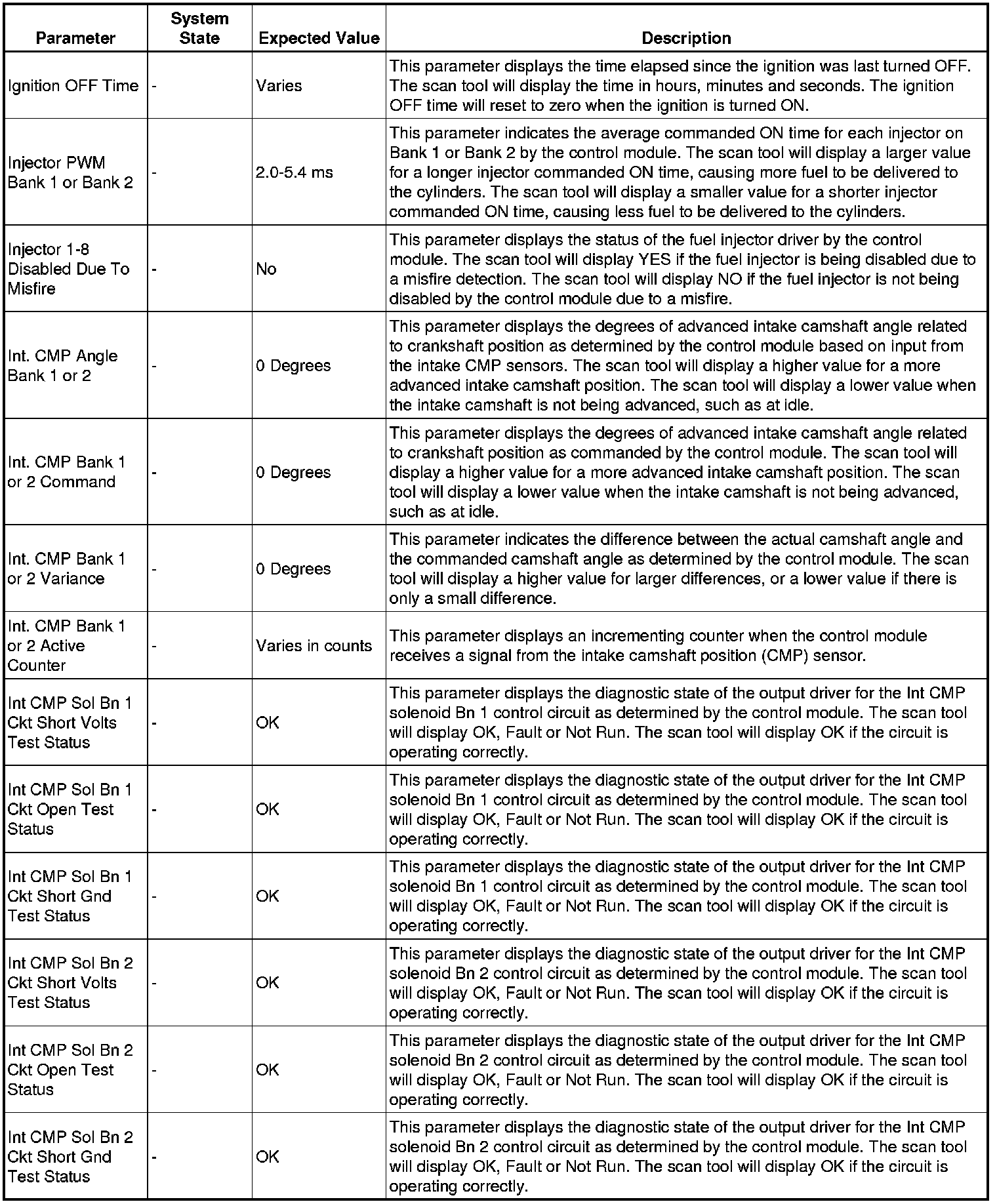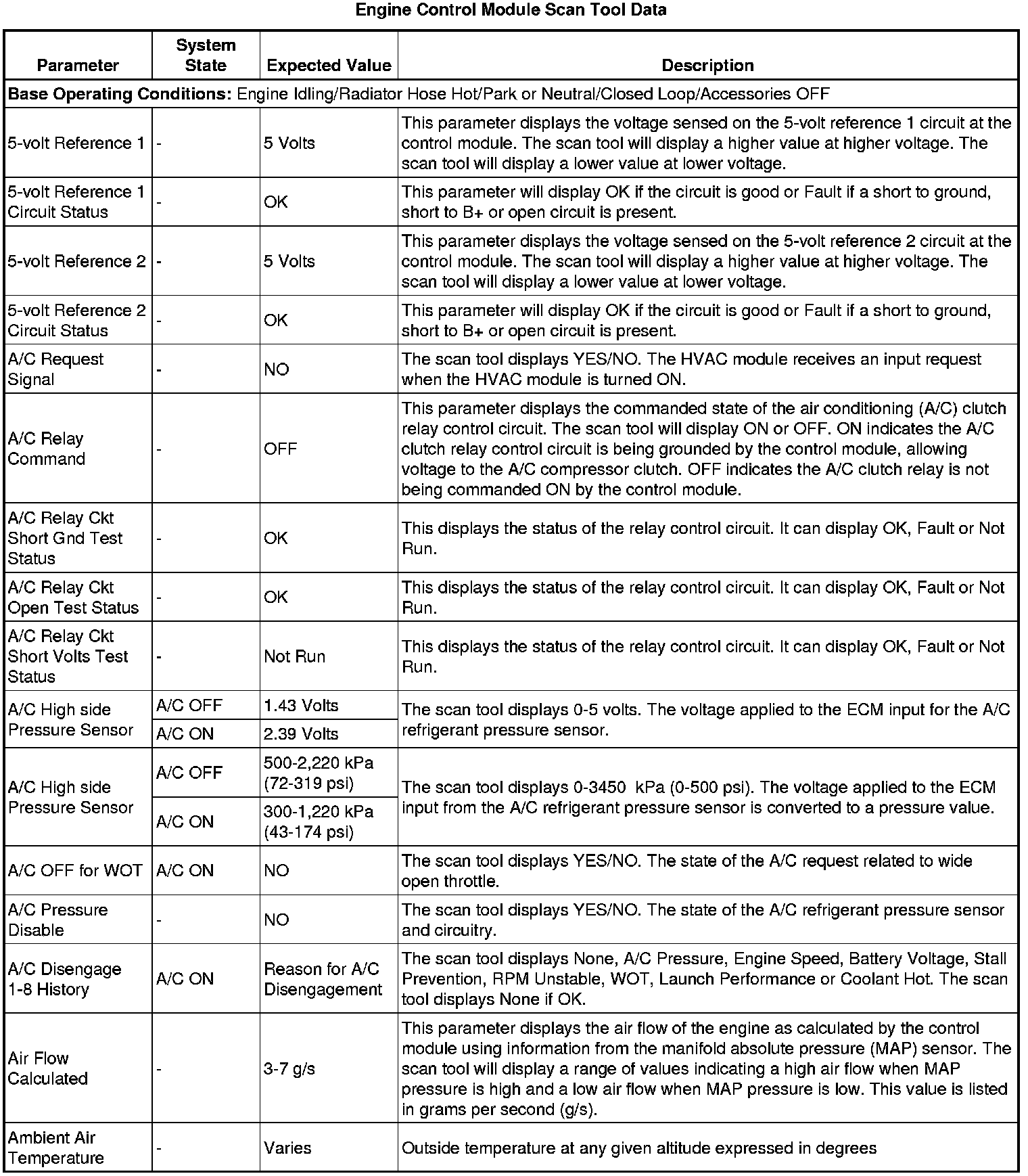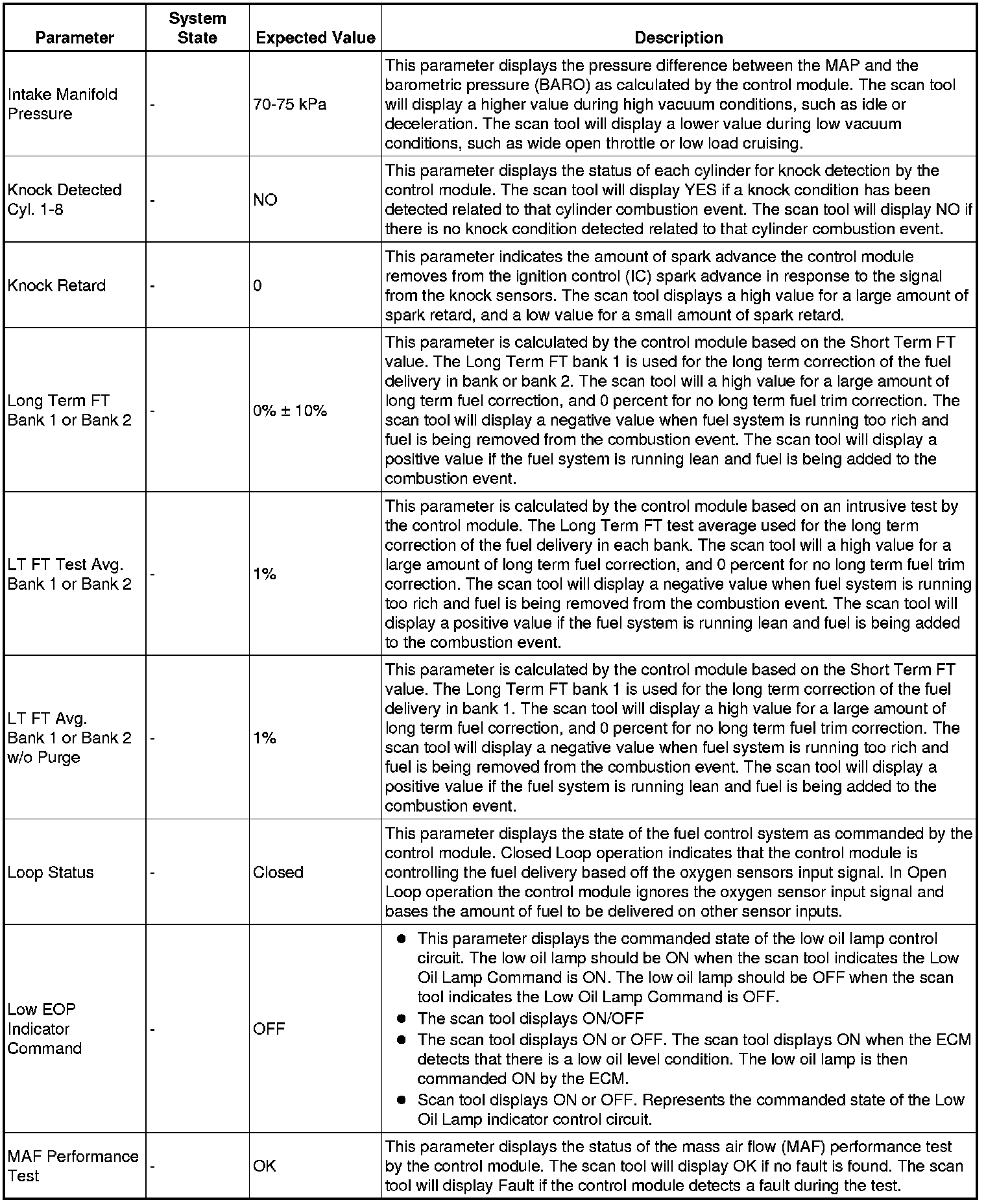 The scan tool values from a properly running engine may be used for comparison with the engine you are diagnosing. The engine scan tool data list represents values that would be seen on a normally running engine.