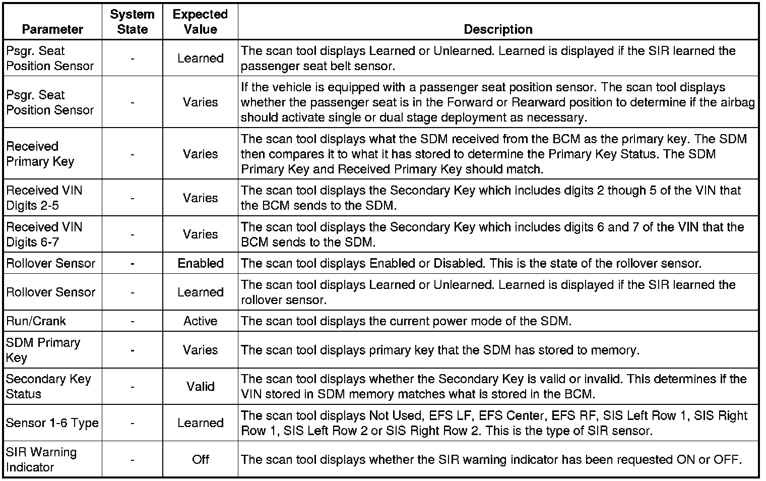 Use the SIR scan tool data list as directed by a diagnostic table or in order to supplement the diagnostic procedures. Begin all of the diagnostic procedures with the Diagnostic System Check - Vehicle (Diagnostic System Check - Vehicle). Use the Scan Tool Data Lists after the following is determined: