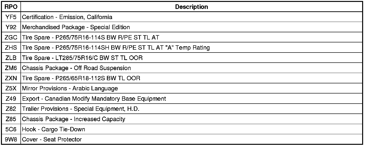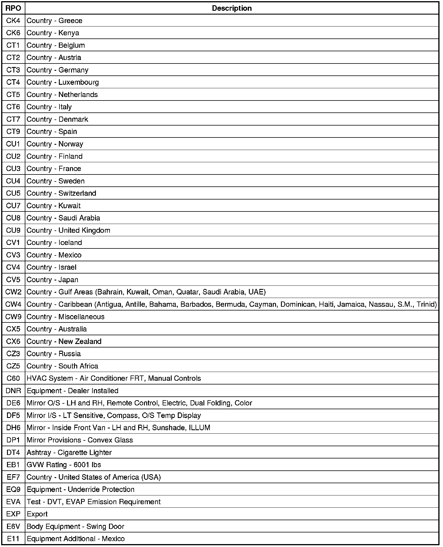 RPO Code List