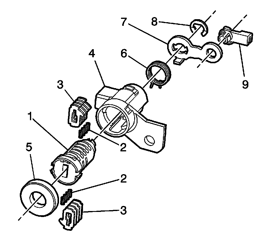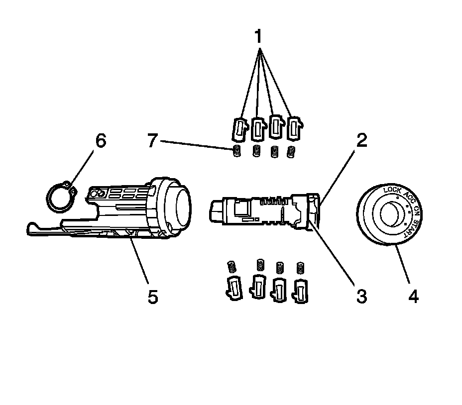 Note: The ignition lock cylinder tumblers (1) are not self retaining and must be held in place if the key is not fully inserted in the lock cylinder (2), or until the lock cylinder (2) is assembled into the case assembly (5).