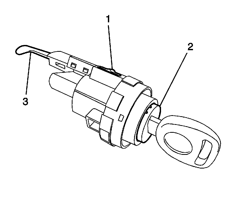14. Push the exposed end of the security plug actuator lever (3) toward the center of the lock cylinder housing (1) and hold it. Insert the coded lock cylinder (2) with the key in it into the ignition lock cylinder housing (1) until the cap is flush with the housing.