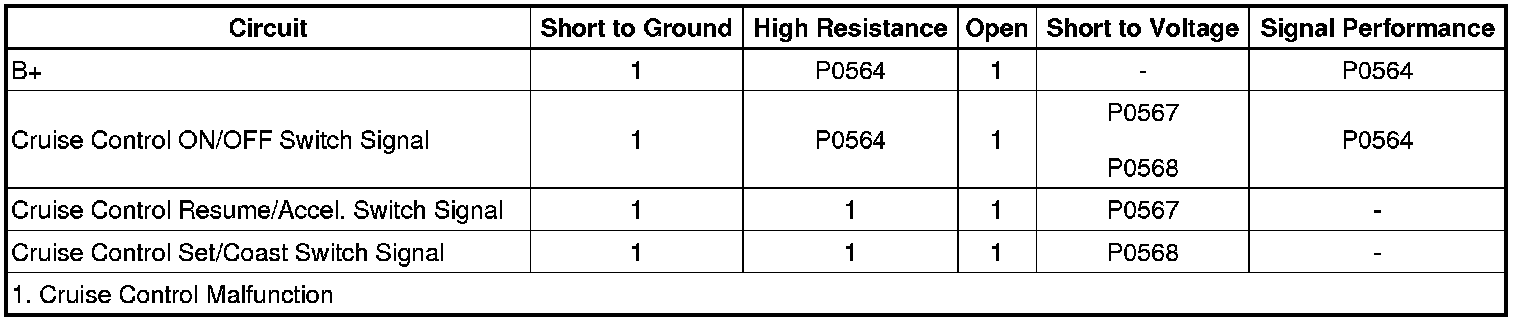 The cruise control switch is an input to the engine control module (ECM). The ECM monitors the cruise control switch signal circuit in order to detect when a cruise control function has been requested. The ECM detects a specific voltage signal on the cruise control switch signal circuit when a cruise control function switch is activated, with each switch having a different predetermined voltage value.