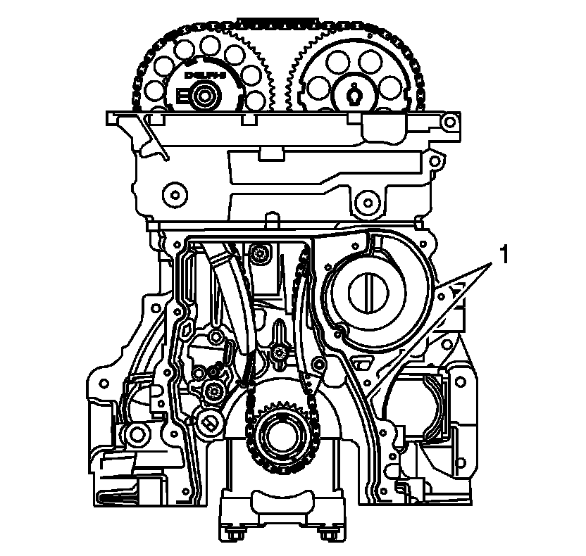 4. Apply a 3 mm (0.12 in) bead of sealer GM P/N 12378521 (Canadian P/N 88901148) to the block sealing surface (1).