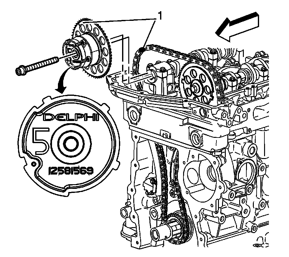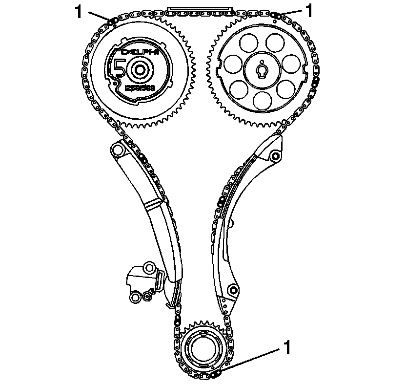 13. The dark links (1) on the timing chain should be aligned with the marks on the sprockets as shown.