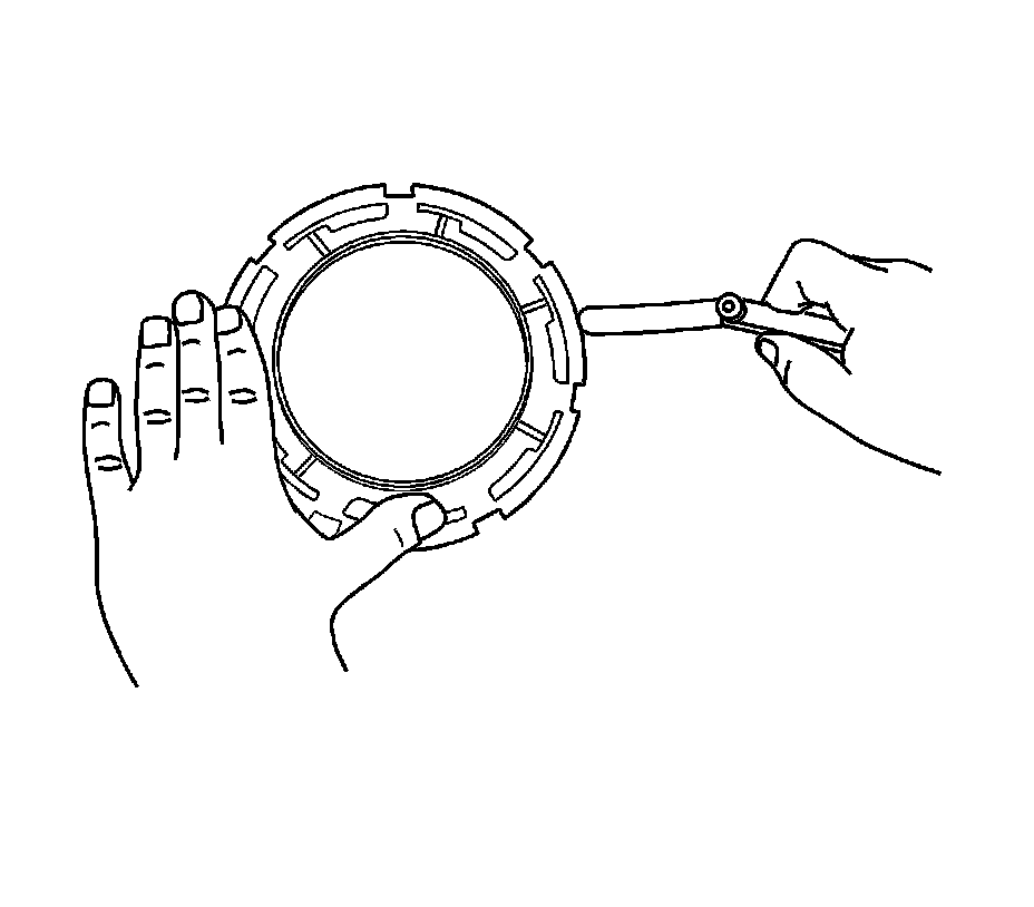Note: Do NOT use impact tools. Significant force will be required to release the lock ring. The use of a hammer and screwdriver is not recommended. Secure the fuel tank in order to prevent fuel tank rotation.