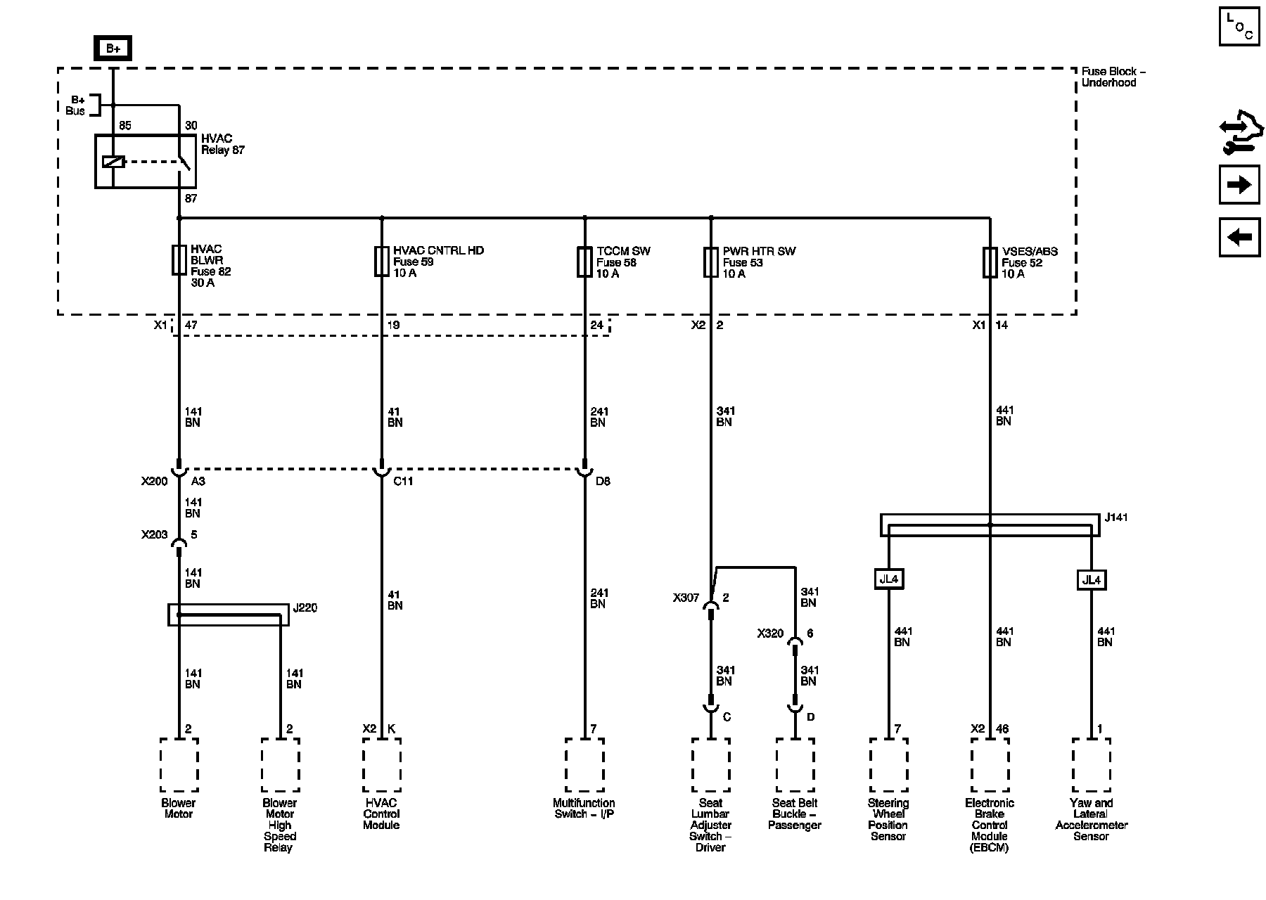 HVAC BLWR, HVAC CNTRL HD, PWR HTR SW, TCCM SW, and VSES/ABS Fuses