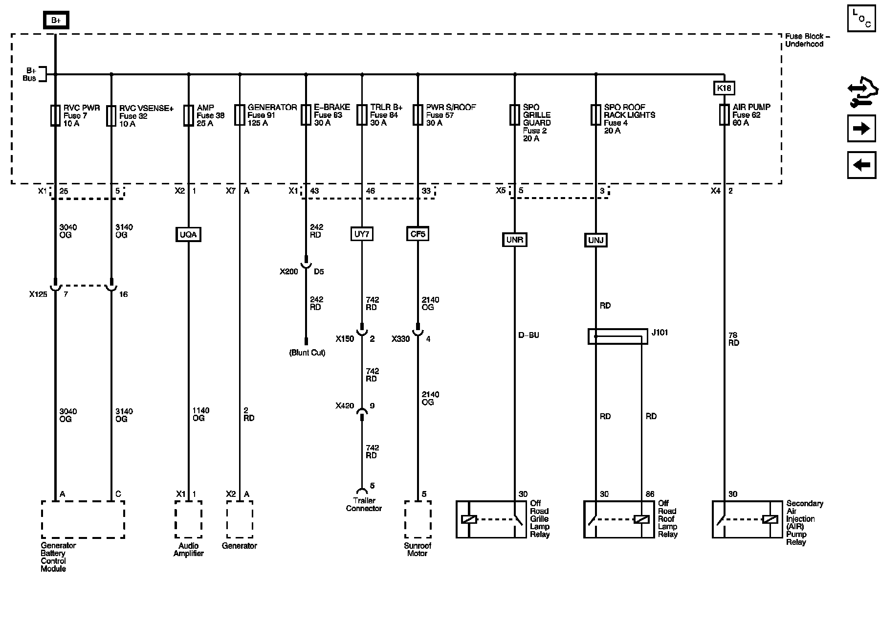 AIR PUMP, AMP, E-BRAKE, GENERATOR, GRILLE GUARD, PWR S/ROOF, ROOF RACK LIGHTS, RVC PWR, RVC VSENSE+, and TRLR B+ Fuses