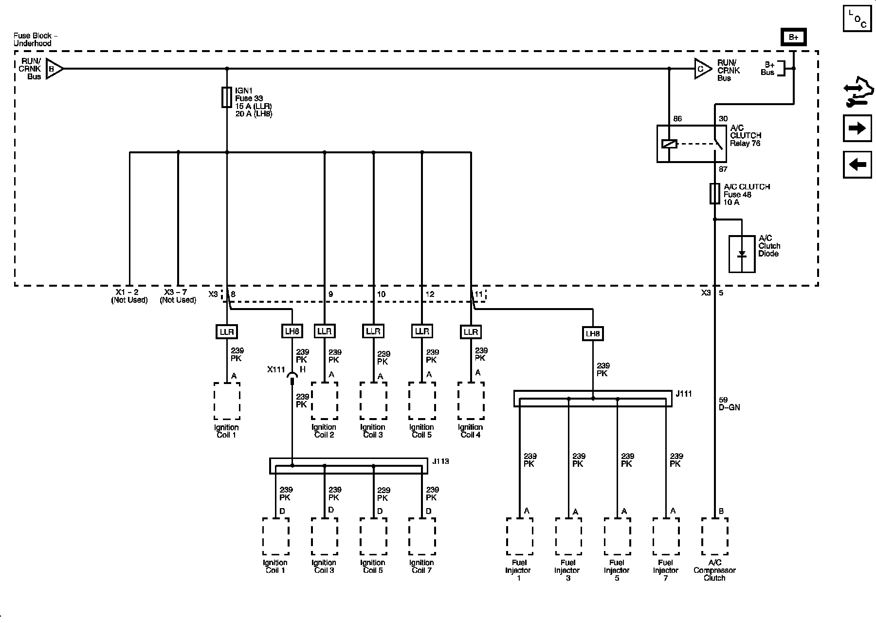 RUN/CRNK Relay Bus (2 of 3), A/C CLUTCH, and IGN1 Fuses