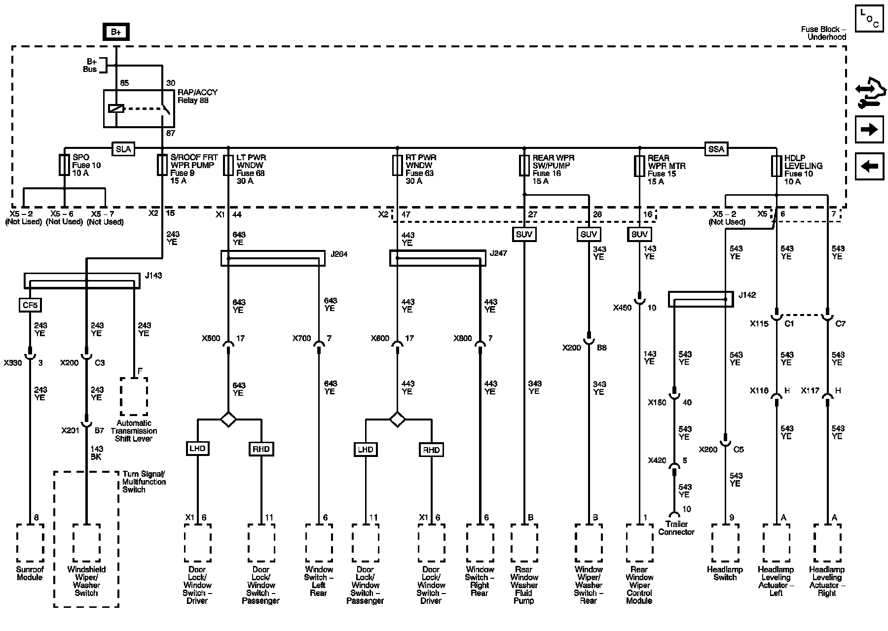 HDLMP LEVELING, LT PWR WNDW, REAR WPR MTR, REAR WPR SW/PUMP, RT PWR WNDW, SPO, and S/ROOF FRT/WPR PUMP Fuses