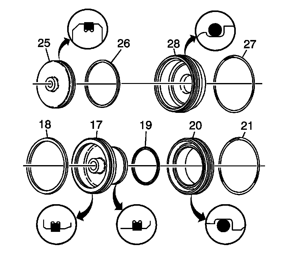 1. Inspect the 4th apply piston (25), the 2-4 servo cover (28), the 2nd apply piston (17), and the servo piston inner housing (20) for the following conditions: