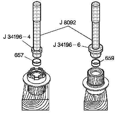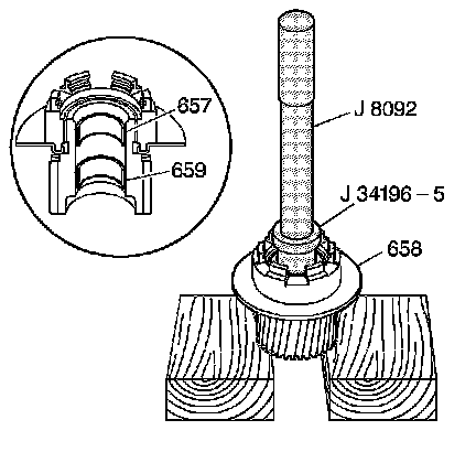 2. Using J 34196-6 which is part of kit J 34196-B - bushing service set with J 8092 - driver handle , install the input sun gear rear bushing (659).