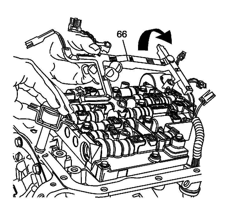 8. Remove the TCC solenoid (with O-ring seal) and wiring harness (66) from the control valve body.