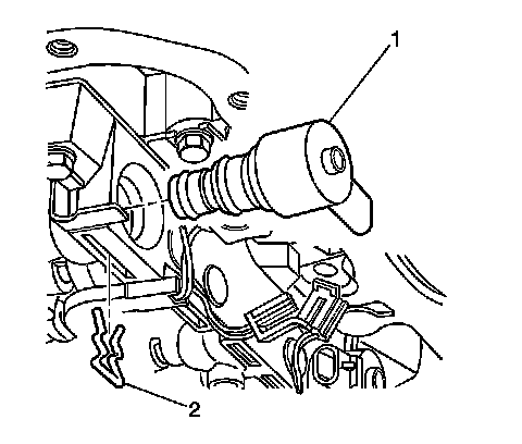 5. Remove the torque converter clutch (TCC) pulse width modulation (PWM) solenoid retainer (2) with a small screwdriver. Rotate the solenoid (1) in the bore, if necessary, until the flat part of the retainer (2) is visible.