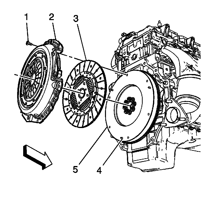 1. Install the clutch pressure plate (2) and driven plate (3) to the dowel pins (4) on the flywheel (5).