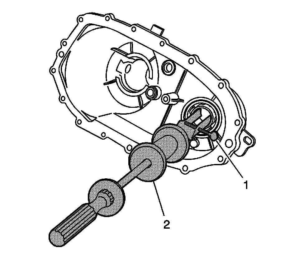 64. Using the J 29369-1 - remover (1) and the J 23907 - adapter (2), remove the front output shaft rear bearing from the rear case.