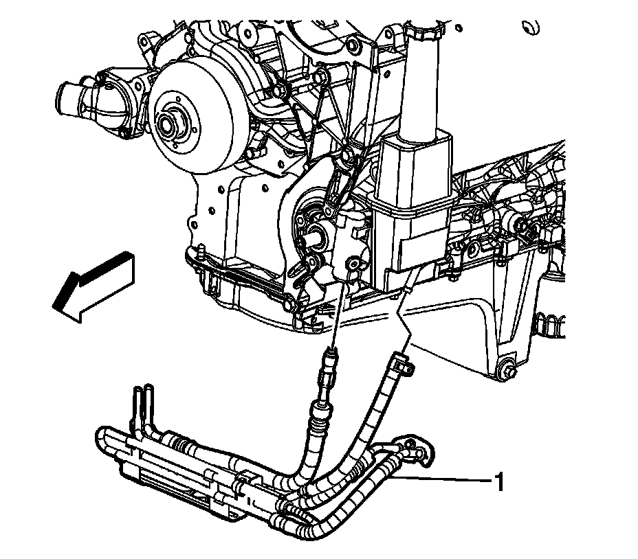 5. Disconnect the power steering gear inlet and outlet hose (1) from the power steering pump and power steering fluid reservoir assembly.