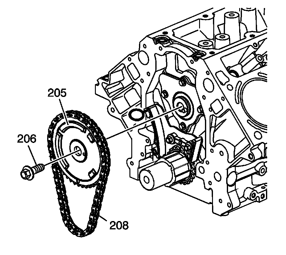 Install the camshaft sprocket (205), timing chain (208), and bolt (206).
