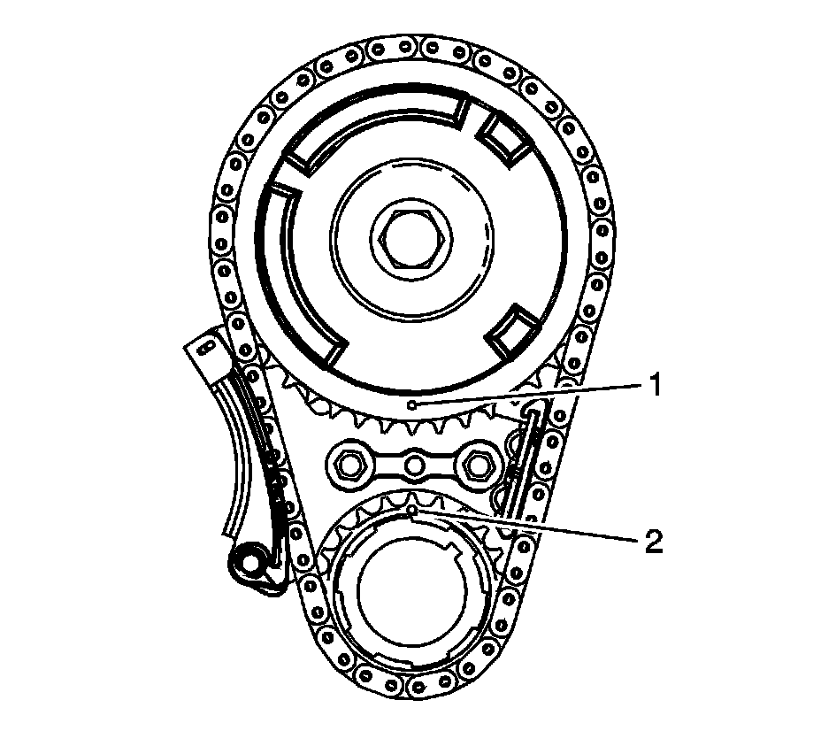 Inspect the sprockets for proper alignment. The mark on the camshaft sprocket (1) should be located in the 6 o'clock position and the mark on the crankshaft sprocket (2) should be located in the 12 o'clock position.