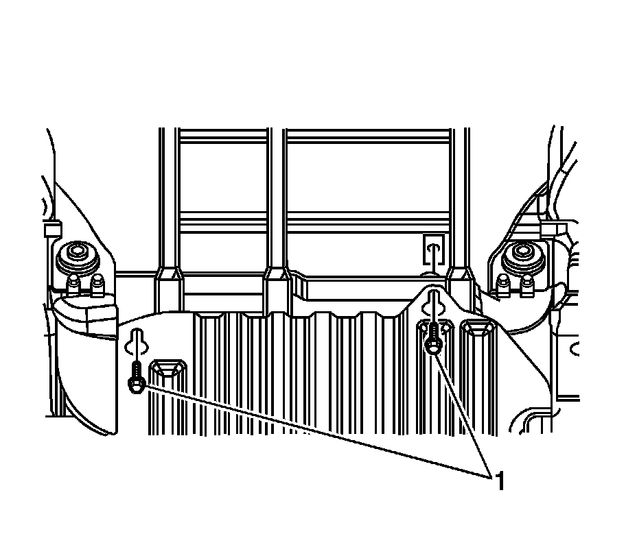 6. Install the bolts (1) and spacer securing the engine shield to the crossmember.