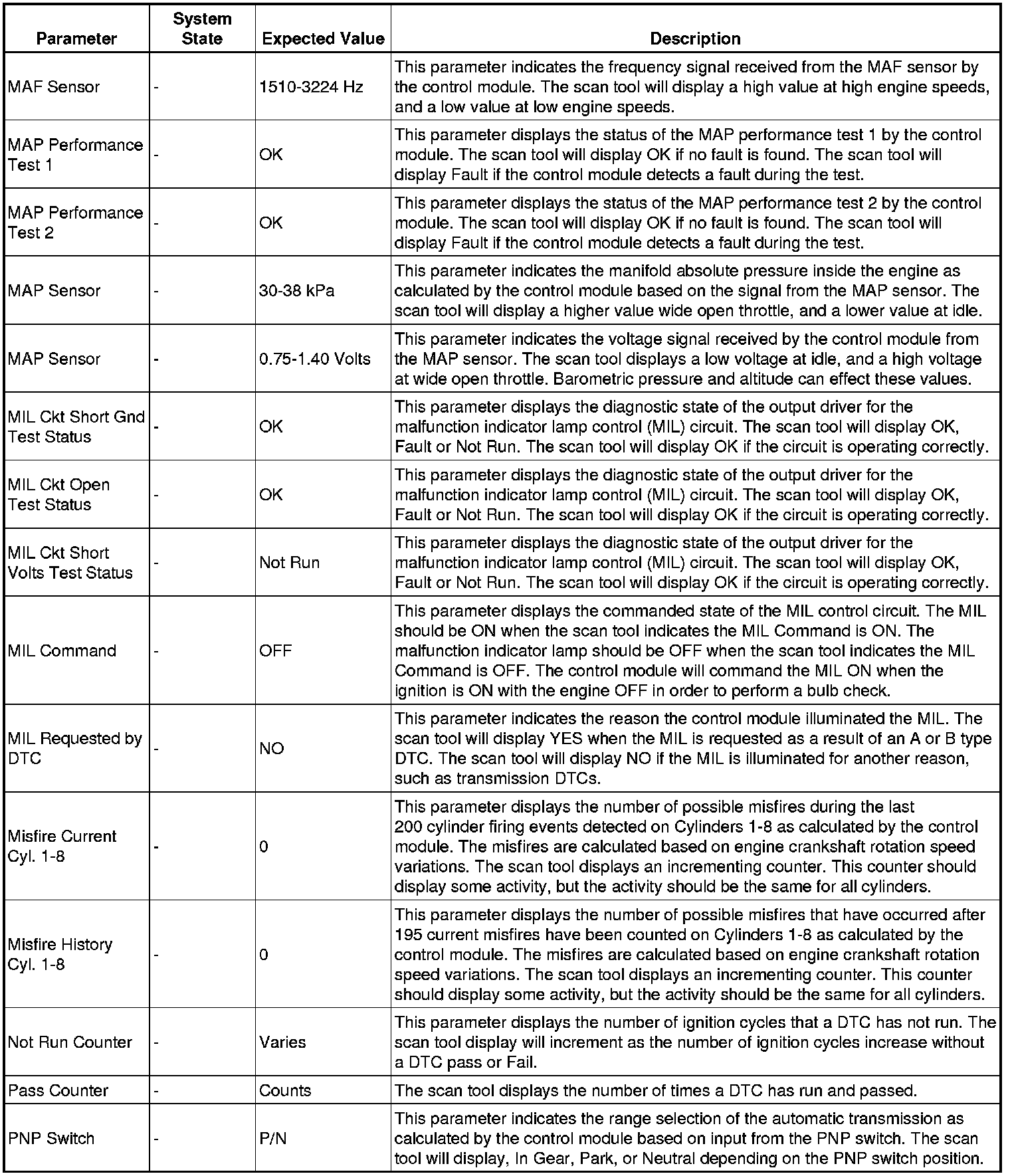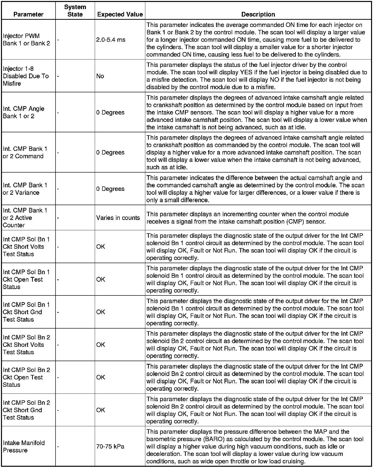 The scan tool values from a properly running engine may be used for comparison with the engine you are diagnosing. The engine scan tool data list represents values that would be seen on a normally running engine.