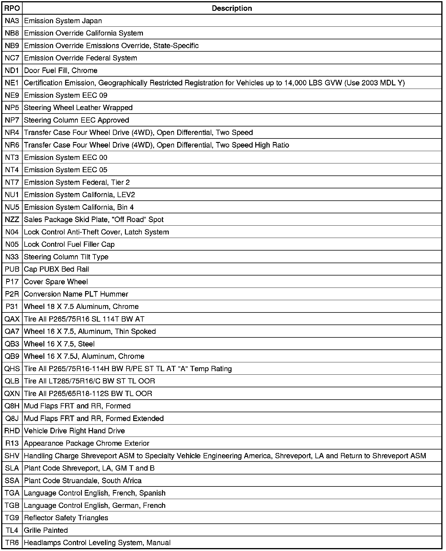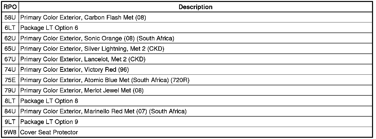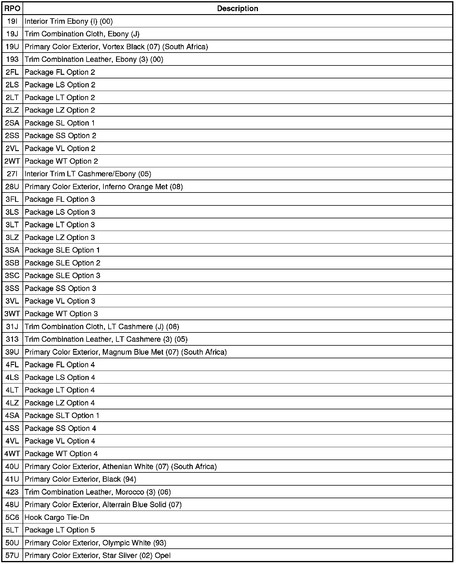 RPO Code List