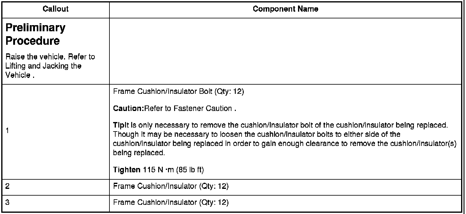 TipIt is only necessary to remove the cushion/insulator bolt of the cushion/insulator being replaced. Though it may be necessary to loosen the cushion/insulator bolts to either side of the cushion/insulator being replaced in order to gain enough clearance to remove the cushion/insulator(s) being replaced.