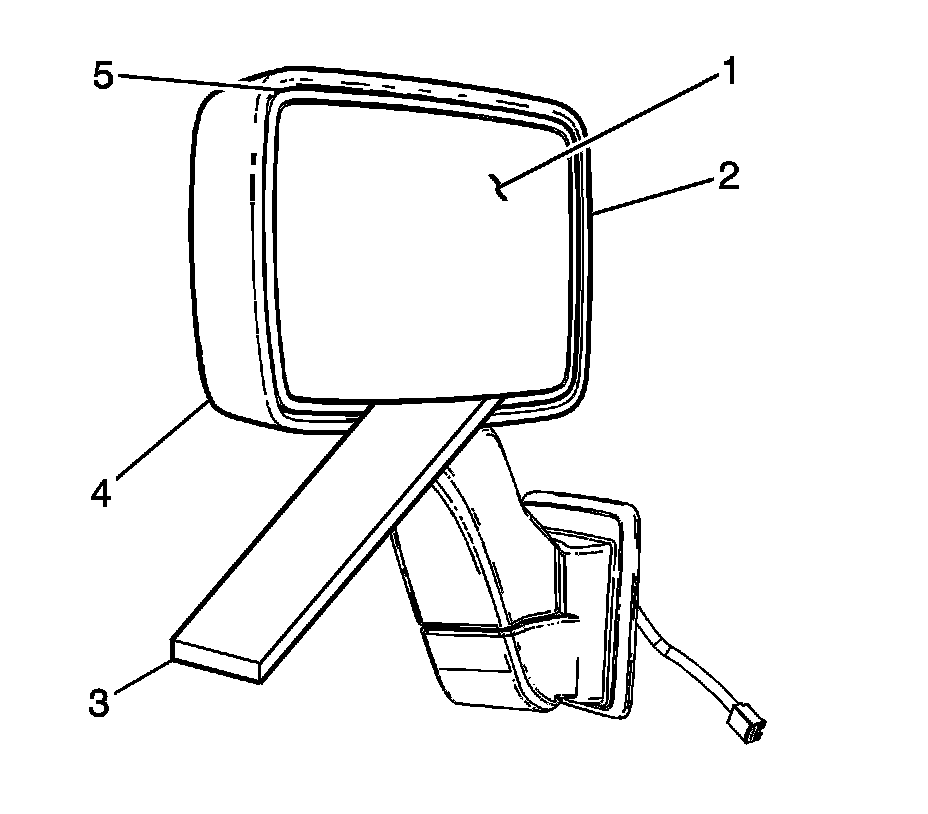 3. Use a suitable rigid plastic tool (3) 3.81 cm (1.5 in) wide. Insert the rigid plastic tool (3) 3 cm (1.5 in) between the mirror lower housing edge (4) and the lower edge of the mirror lens (5).