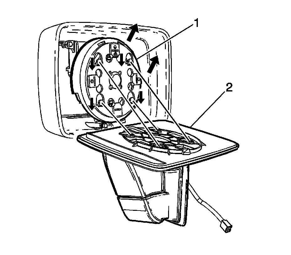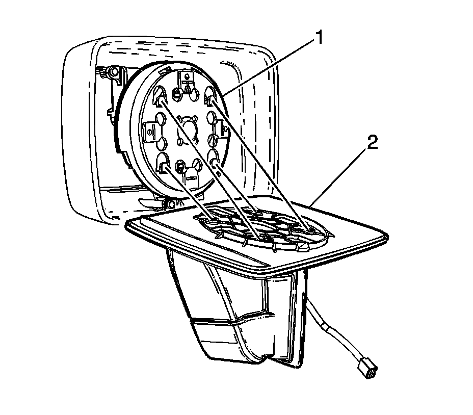 2. Position the mirror lens (1) on the mirror motor/actuator ring retaining tabs (2).