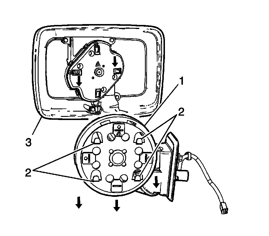 4. Push downward on the top of the mirror glass (1) using a suitable tool until it is locks onto the retaining tabs (2).