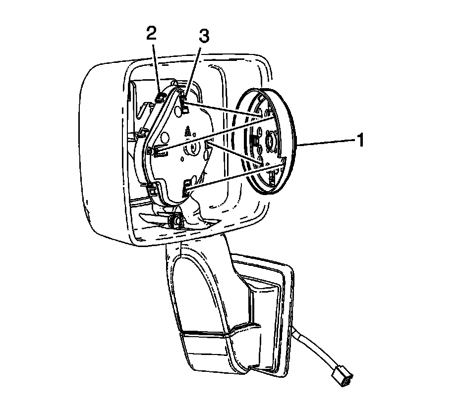 2. Remove the motor/actuator ring (1), by sliding the ring downward releasing the tabs (2) from the back mirror lens (3).