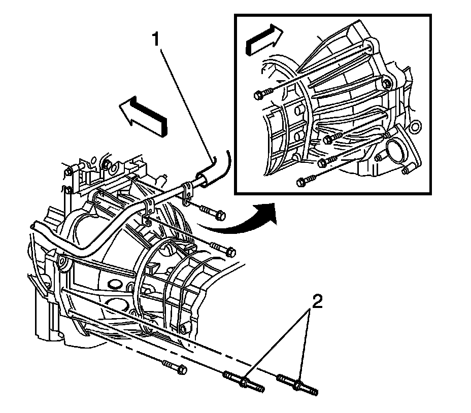 9. Loosely install the 2 transmission mounting bolts (2).